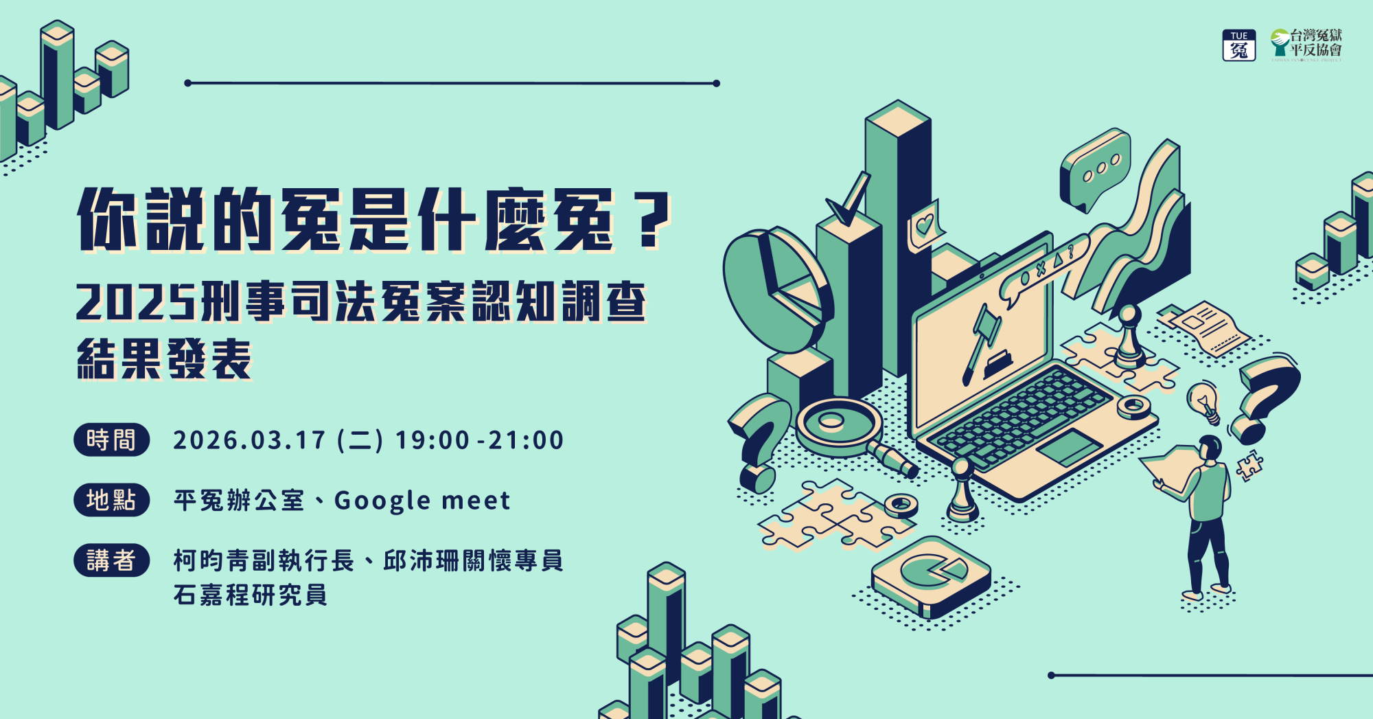 相較於美國有大量冤案研究與資料庫,台灣在這一塊的實證資料非常有限,也一直難以回答這個提問。2025年底,在「以包容為導向之科技計畫–公民智慧培力計畫」的支持之下,平冤首度進行面向大眾的「刑事司法冤案認知調查」。我們以公開量化問卷的方式,系統性蒐集民眾對司法制度的基本認知、信任程度,以及對冤案議題的整體看法,並在最終回收了共1048份有效樣本。這些數據反映了什麼樣的資訊?又能為未來的倡議與制度改革提供哪些參考呢?本次冤TUE.講座,將由參與這場研究計畫的平冤祕書處成員──柯昀青副執行長、邱沛珊關懷專員、石嘉程研究員分享本次的調查成果!
